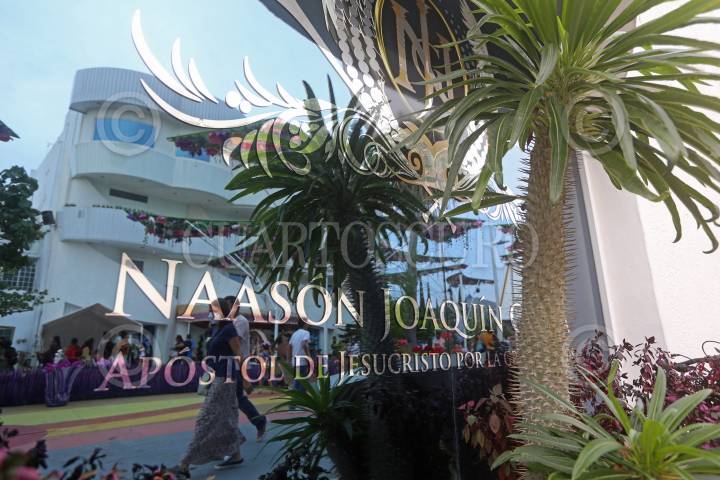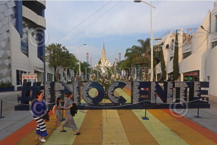 Personas de la religión de la Luz del Mundo, caminan por donde se encuentra la palabra de Inocente, esto colocado hace meses en apoyo a su líder, Naasón Joaquín García.
