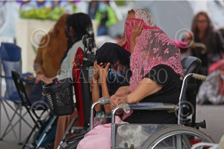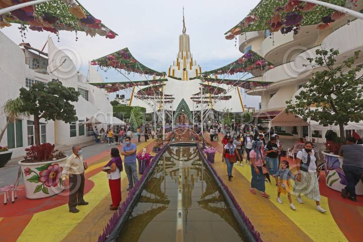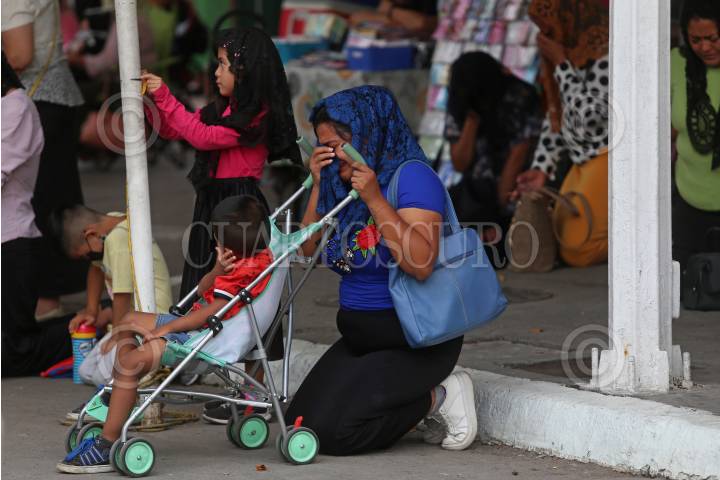 Personas de la religión de la Luz del Mundo, caminan por las inmediaciones de la Hermosa Provincia.