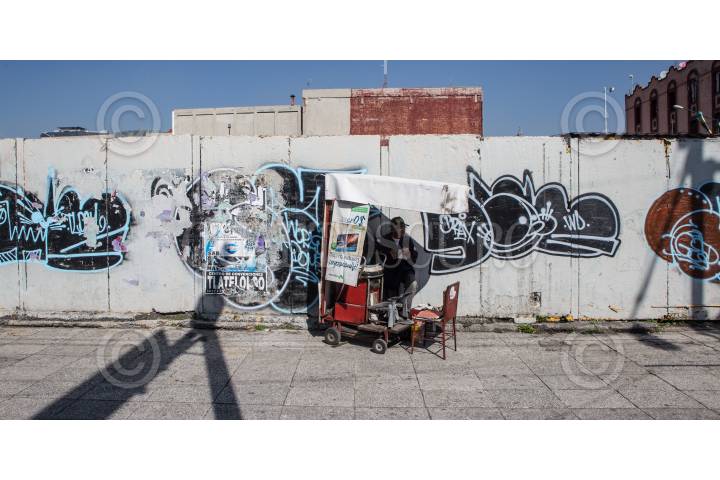 CIUDAD DE MÉXICO, 25JUNIO2018.- Un transeúnte come pide comida en un puesto de alimentos entre las calles grafiteadas del Centro Histórico. FOTO: TERCERO DÍAZ /CUARTOSCURO.COM