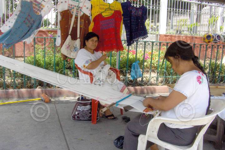 CHILPANCINGO, GUERRERO 21MAYO2006.- Un par de mujeres indigenas, tejen ropa tipica de la costa a mano, esto durante el planton que mantienen en el zocalo de la ciudad integrantes de la organizacion indigena "Calpulli Tecuanichan", para exigir la creacion del Instituto de Arte y Cultura Indigena, proyecto que no ha sido respaldado por el gobierno estatal. FOTO: Oscar Alvarado/CUARTOSCURO.COM
