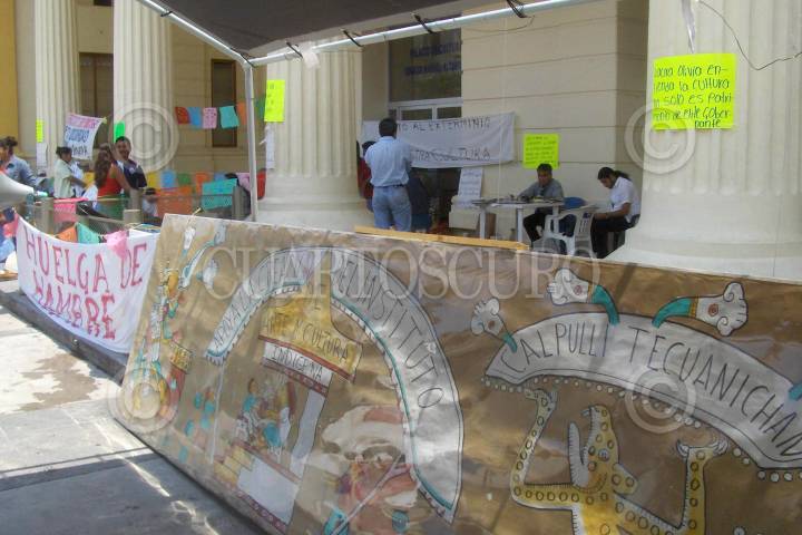 CHILPANCINGO, GUERRERO 25MAYO2006.- Integrantes de la organizacion indigena "Calpulli Tecuanichan", durante el planton indefinido y huelga de hambre que mantienen afuera del palacio de la cultura para exigir al gobierno estatal la creacion del Instituto de Arte y Cultura Indigena y al cual se unió nuevamente su dirigente Gelacio Gatica luego de convalecer en el Hospital General por los desmayos que sufrió debido a la falta de alimentos. FOTO: Oscar Alvarado/CUARTOSCURO.COM