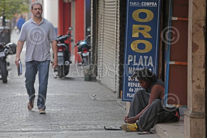GUADALAJARA, JALISCO, 04ENERO2018.- Un hombre en situación de calle, abrocha las agujetas de su calzado a las afueras de una casa de compra-venta de oro, plata, diamantes etc., en el centro de la ciudad. FOTO: FERNANDO CARRANZA GARCIA / CUARTOSCURO.COM