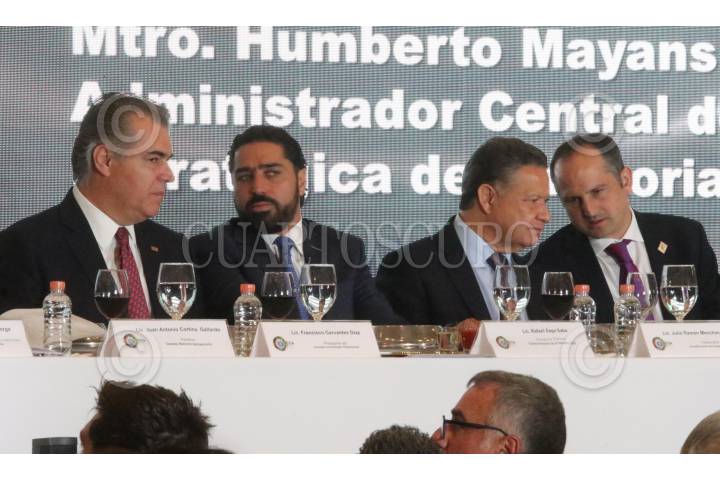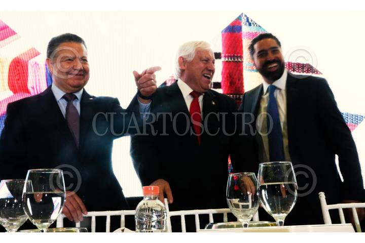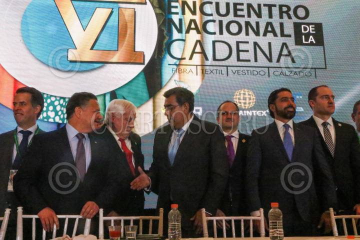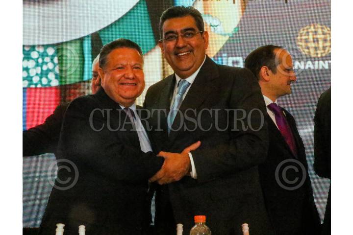 Julio Menchaca gobernador de Hidalgo y Jorge Salomón Céspedes mandatario de Puebla, en el VI congreso de industriales textileros y de calzado.