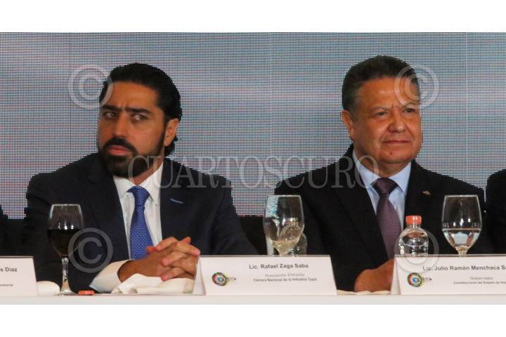 Rafael Zaga y el gobernador de Hidalgo Julio Menchaca en el VI congreso de la industria textil y del calzado, en la hacienda de los Morales.
