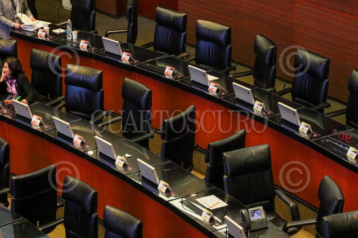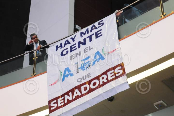 CIUDAD DE MÉXICO, 25ABRIL2024. - Senadoras del PAN colocan una manta en el pleno del Senado haciendo alusión a la falta de gente en el AIFA. FOTO: DANIEL AUGUSTO /CUARTOSCURO.COM