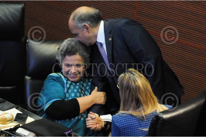 CIUDAD DE MÉXICO, 13FEBRERO2024. - El coordinador priista en el Senado, Manuel Añorve, le da un beso a su compañera de bancada, Beatriz Paredes. FOTO: DANIEL AUGUSTO /CUARTOSCURO.COM