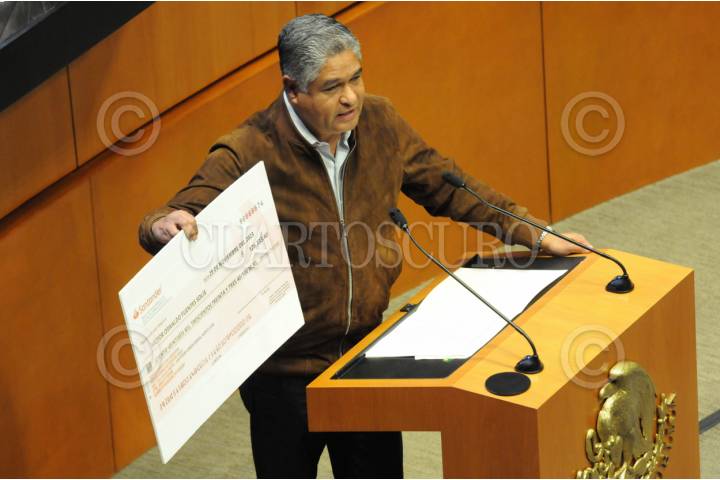 CIUDAD DE MÉXICO, 13FEBRERO2024. - José Alfredo Botello, senador del PAN, muestra el cheque que recibe cada senador al mes. FOTO: DANIEL AUGUSTO /CUARTOSCURO.COM