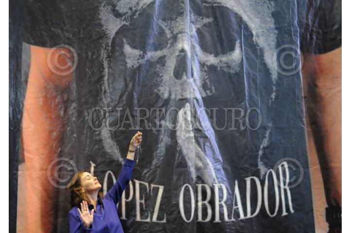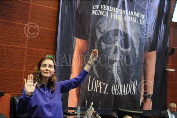 CIUDAD DE MÉXICO, 25ABRIL2024. - Los senadores panistas colocaron una manta con la publicación que en días anteriores publicó el partido Morena en su cuenta de "X", la publicación muestra una playera con la leyenda "Un verdadero hombre no habla mal de López Obrador" más la figura de la Santa Muerte, frente a la manta, Lilly Telléz posa frente a las cámaras con un rosario en la mano. FOTO: DANIEL AUGUSTO /CUARTOSCURO.COM