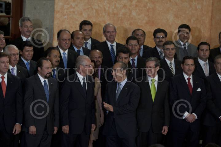 MÉXICO, D.F., 03MAYO2012.- Felipe Calderón Hinojosa, Presidente de los Estados Unidos de Mexicanos, y Luis Zárate Rocha, presidente de la Cámara Mexicana de la Industria de la Construcción, durante la ceremonia en la cual se le tomo protesta al consejo directivo 2012-2013 de la CMIC, en la residencia oficial de Los Pinos. FOTO: MOISÉS PABLO /CUARTOSCURO.COM