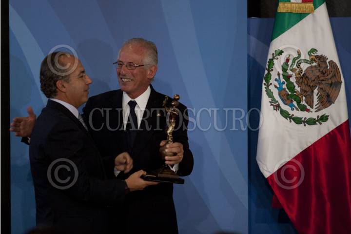 MÉXICO, D.F., 03MAYO2012.- Felipe Calderón Hinojosa, Presidente de los Estados Unidos de Mexicanos, recibió una escultura por parte de Luis Zárate Rocha, presidente de la Cámara Mexicana de la Industria de la Construcción, durante la ceremonia en la cual se le tomo protesta al consejo directivo 2012-2013, en la residencia oficial de Los Pinos. FOTO: MOISÉS PABLO /CUARTOSCURO.COM