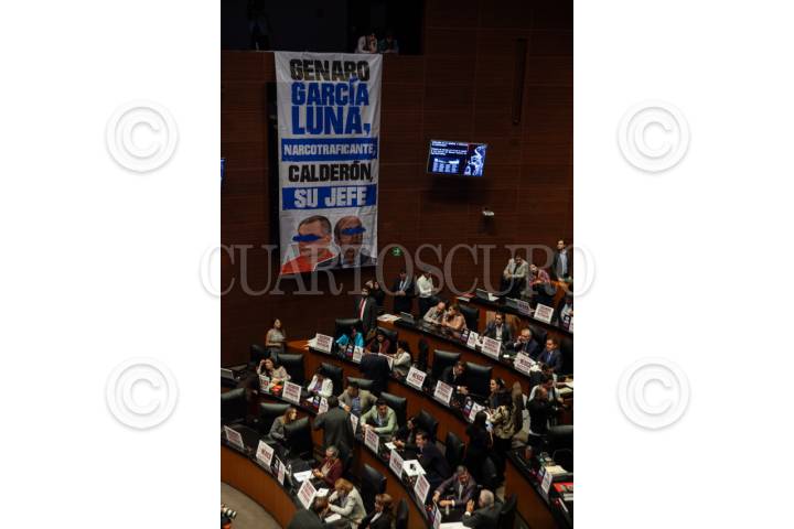 CIUDAD DE MÉXICO, 01JULIO2025.- El grupo parlamentario de Morena colocó manta con la insignia que dice Gerardo García Luna, narcotraficante; Calderón su jefe durante sesión extraordinaria en la Cámara de Senadores. FOTO: ANDREA MURCIA /CUARTOSCURO.COM