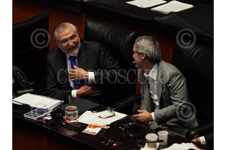 CIUDAD DE MÉXICO, 23JULIO2025.- Adán Augusto López, coordinador del Grupo parlamentario de Morena y el senador José Ramón Gómez Leal durante Sesión de la Comisión Permanente del Congreso de la Unión que se lleva a cabo en la Cámara de Senadores. FOTO: ANDREA MURCIA /CUARTOSCURO.COM