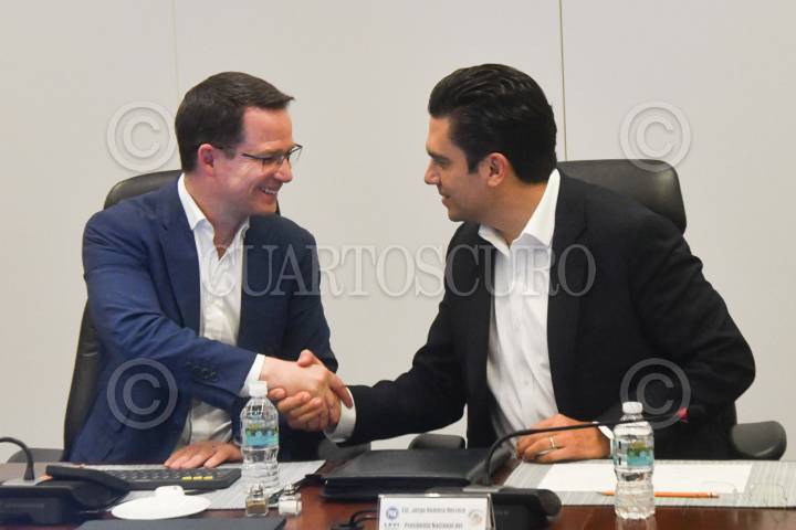 CIUDAD DE MÉXICO, 30AGOSTO2025.- Ricardo Anaya, senador y coordinador del PAN, junto a Jorge Romero Herrera, dirigente nacional del PAN, durante la reunión plenaria del Grupo Parlamentario del PAN previo al nuevo periodo de sesiones de la LXVI Legislatura de la Cámara de Senadores que iniciará el próximo 1 de septiembre. FOTO: MARIO JASSO/CUARTOSCURO.COM