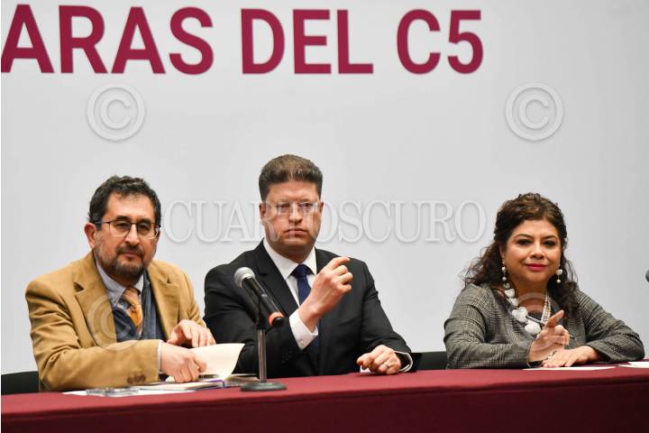 CIUDAD DE MÉXICO, 28ENERO2025.- Clara Brugada, jefa de Gobierno, encabezó la presentación de las nuevas cámaras del Centro de Comando, Control, Cómputo, Comunicaciones y Contacto Ciudadano de la Ciudad de México "C5". El gobierno capitalino buscará pasar de 83 mil cuatrocientas a 150 mil cámaras de videovigilancia. La acompañan: César Cravioto, secretario de Gobierno de la capital, y Pablo Vázquez, secretario de Seguridad Ciudadana. FOTO: MARIO JASSO/CUARTOSCURO.COM