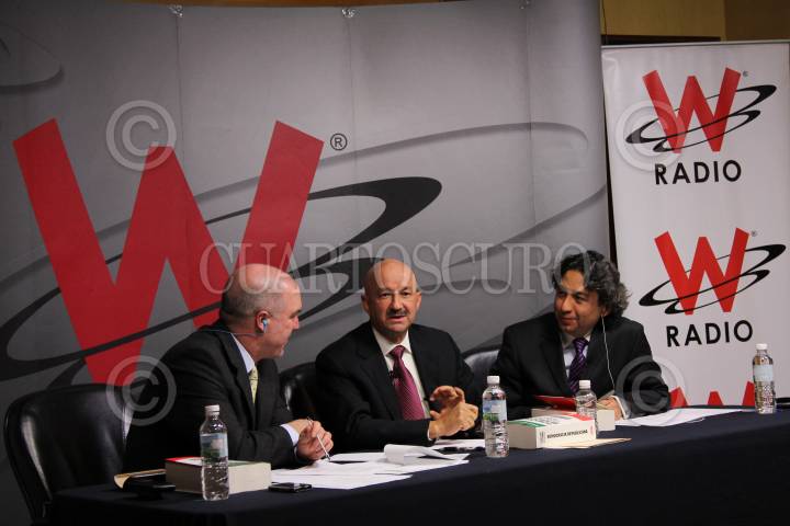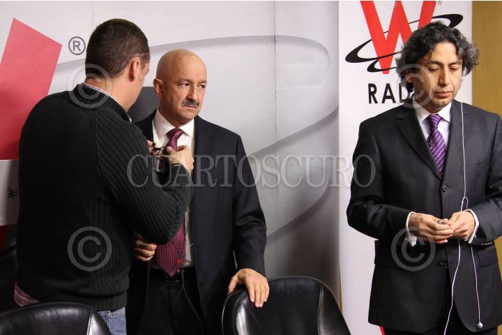 MEXICO, D.F., 15DICIEMBRE2010.- Carlos Salinas de Gortari, ex presidente de México (1988-1994), asistió al programa radiofónico Foro W organizado por la radiodifusora W Radio y conducido por Carlos Puig y Salvador Camarena (derecha). El ex presidente respondió preguntas del público asistente al foro y habló sobre su nuevo libro "Democracia Republicana, Ni Estado ni mercado una alternativa ciudadana". Esto se realizó en las instalaciones de esta radio al sur de la Ciudad de México. FOTO: MISAEL VALTIERRA/CUARTOSCURO.COM