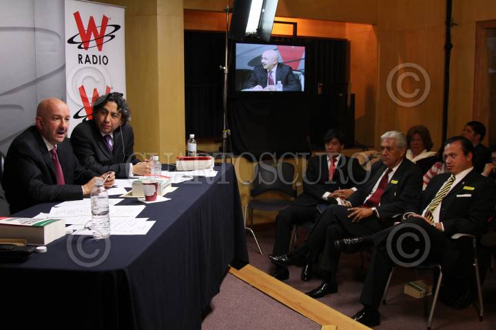 MEXICO, D.F., 15DICIEMBRE2010.- Salvador Camarena (derecha), periodista y conductor del programa radiofónico Hoy x Hoy, tercera edición, durante el programa Foro W organizado por la radiodifusora W Radio y quien a esta ocación estuvo de asistente Carlos Salinas de Gortari (izquierda), ex presidente de México (1988-1994). El ex presidente respondió preguntas del público asistente al foro y habló sobre su nuevo libro "Democracia Republicana, Ni Estado ni mercado una alternativa ciudadana". Esto se realizó en las instalaciones de esta radio al sur de la Ciudad de México. FOTO: MISAEL VALTIERRA/CUARTOSCURO.COM
