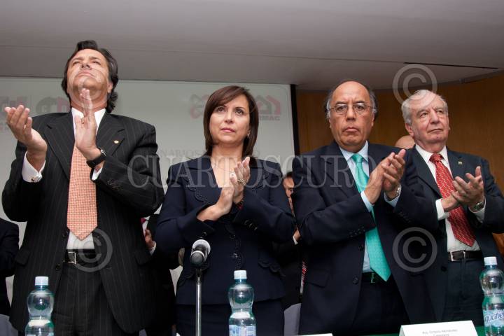 MÉXICO, D.F., 03MAYO2011.- Guillermo Ruíz de Tereza, secretario general adjunto de la Confederación Nacional de Organizaciones Populares (CNOP); María Cristina Díaz Salazar, secretaria general del Partido Revolucionario Institucional (PRI); Octavio Hernández Camarena, presidente electo de Arquitectos Revolucionarios de México, A.C. (ARMAC) y Pedro Ojeda Paullada, presidente de la Federación de Abogados al Servicio de México; durante la toma de protesta de los nuevos dirigentes de la ARMAC. Ésto se realizó en el CEN del PRI. FOTO: MISAEL VALTIERRA/CUARTOSCURO.COM