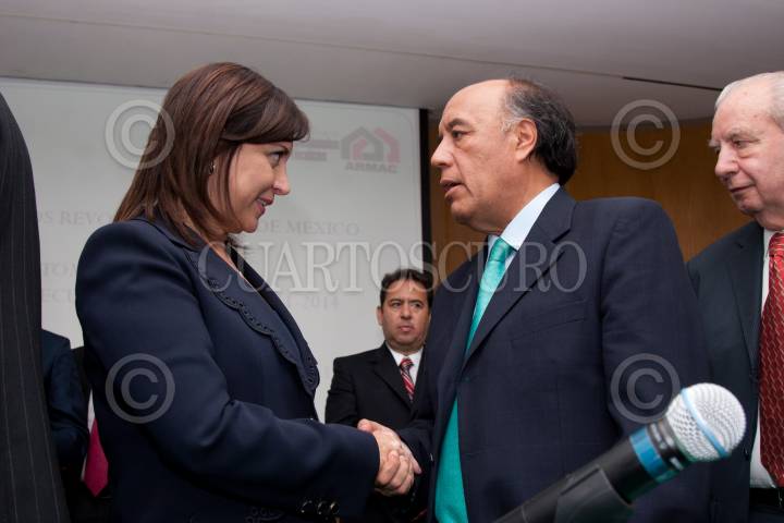 MÉXICO, D.F., 03MAYO2011.- María Cristina Díaz Salazar, secretaria general del Partido Revolucionario Institucional (PRI) saluda a Octavio Hernández Camarena, presidente electo de Arquitectos Revolucionarios de México, A.C. (ARMAC); durante la toma de protesta de los nuevos dirigentes de la ARMAC. Ésto se realizó en el CEN del PRI. FOTO: MISAEL VALTIERRA/CUARTOSCURO.COM