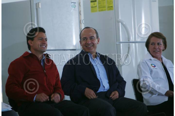 SAN MATEO NOPALA, EDO DE MEXICO, 23ABRIL2009.- Enrique Peña Nieto, gobernador del Estado de México; Felipe Calderón Hinojosa, presidente de México y Georgina Kessel, secretaria de Energía, durante el evento "Cambia tu viejo por uno nuevo" que tuvo lugar en este municipio. FOTO: ARIEL GUTIERREZ/CUARTOSCURO.COM