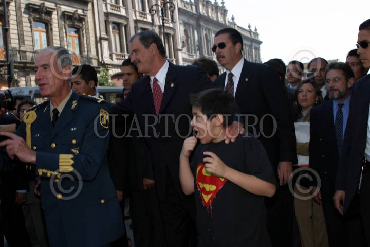 México D.F., 20OCT2004.- El primer mandatario de la Nación, Vicente Fox, camino del Palacio de Minería a Bellas Artes acompañado de medios de comunicación y de su seguridad, algunos ciudadanos le saludaban. FOTO: Victoria Valtierra/CUARTOSCURO.COM