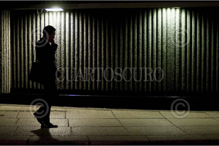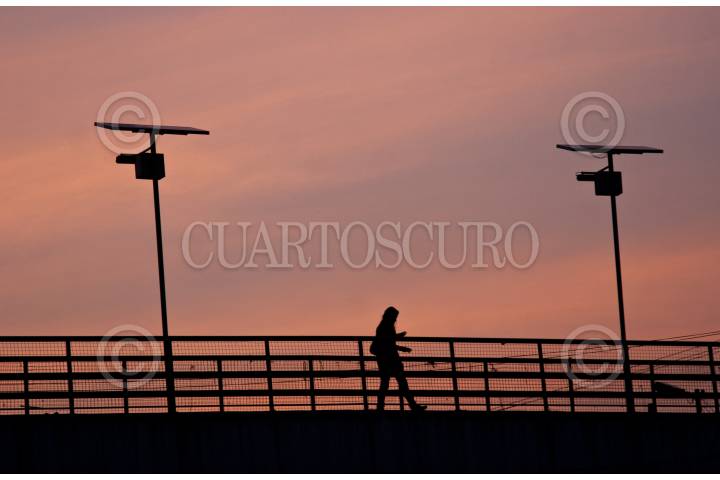 MÉXICO, D.F., 18MAYO2011.- Amanecer al sur de la Ciudad de México, mientras una mujer atraviesa un puente peatonal sobre Eje 10 Sur. FOTO: MISAEL VALTIERRA/CUARTOSCURO.COM