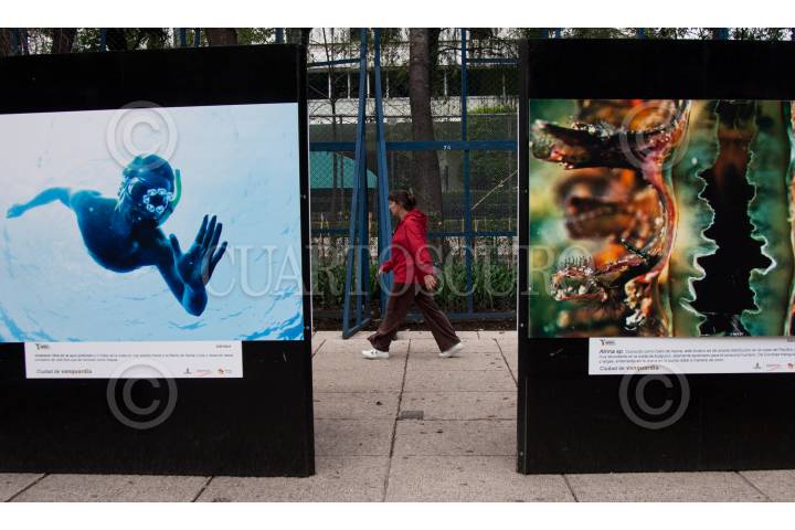 MÉXICO, D.F, 08JULIO2011.- Una mujer camina sobre avenida Paseo de la Reforma entre dos mamparas que tienen montada una exposición fotográfica sobre naturaleza. FOTO: MISAEL VALTIERRA/CUARTOSCURO.COM
