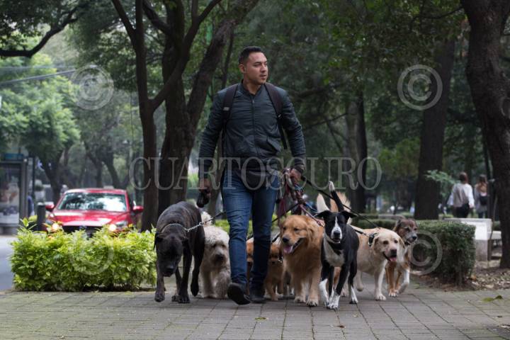 CIUDAD DE MÉXICO, 25SEPTIEMBRE2018.- Un joven pasea 10 caninos por las calles de la Colonia Polanco. El “paseador de perros” gana entre 200 y 500 pesos por cuidar a las mascotas. FOTO: MAGDALENA MONTIEL CUARTOSCURO.COM