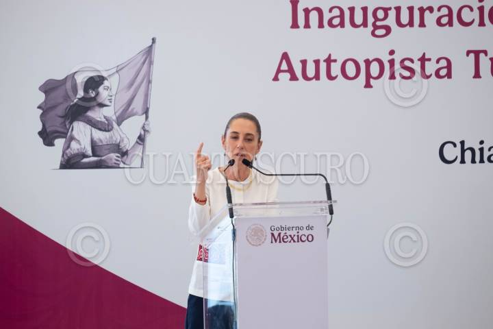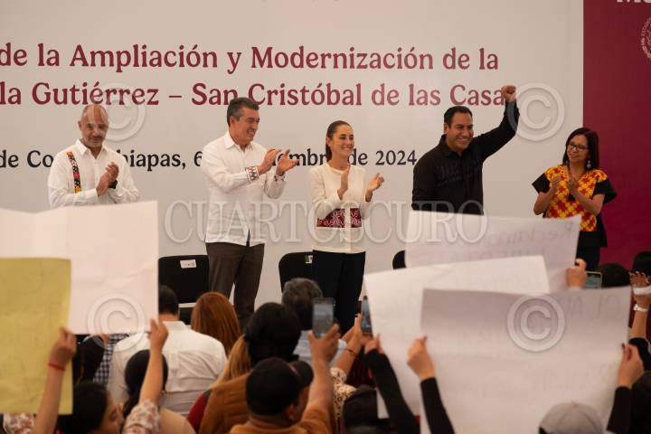 TUXTLA GUTIÉRREZ, CHIAPAS, 06DICIEMBRE2024.- La presidenta Claudia Sheinbaum inauguró la ampliación y mejoramiento de la autopista Tuxtla -San Cristobal, acompañada del gobernador entrante Eduardo Ramirez; el actual gobernador del estado Rutilio Escandón; Jesús Esteban Medina, Secretario de Infraestructura, Comunicaciones y Transportes en el templete, donde se especificó la construcción de puentes para ampliar a dos carriles uno de los sentidos de la autopista, tres rampas de frenado con iluminación, y mejoramiento de los más de 50 kilómetros de via. Durante de la inauguración un grupo de personas ubicado en las primeras filas, subían y bajaban cartulinas frente a los que presidían el evento, en ellas se denunciaban; la violencia que se vive en la región de Pantelho, municipio ubicado a 120 kilómetros, 72 horas continuas de enfrentamientos armados en la cabecera municipal y libertad. La doctora Claudia Sheinbaum se refirió a ellos diciendo que atenderían el caso y se había hablado en la mesa de seguridad, les aseguró que hablaría con ellos, quienes hasta el final mostraron sus demandas. FOTO: ISABEL MATEOS /CUARTOSCURO.COM