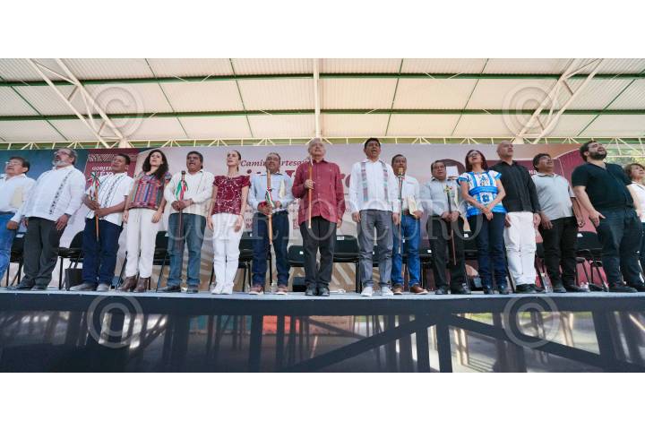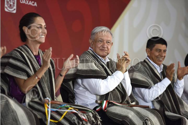 GUELATAO DE JUÁREZ, OAXACA, 21SEPTIEMBRE2024.- Andrés Manuel López Obrador, presidente de México y Claudia Sheinbaum Pardo, presidenta electa de México encabezaron la inauguración del Camino de Benito Juárez y evaluación de Caminos de mano de obra de Oaxaca en las Canchas techadas de Guelatao de Juárez. Los acompañan Isaías García Soto, presidente municipal de Guelatao de Juárez; Alejandro Luján Manuel, presidente municipal de Tlalixtac de Cabrera; Adelfo Regino Montes, director general del Instituto Nacional de los Pueblos Indígenas; Efraín Juárez Lara, presidente municipal de San Juan Chicomezúchil; Jorge Nuño Lara, secretario de Infraestructura, Comunicaciones y Transportes; Nicolás Hernández Martínez, presidente municipal de Santa Catarina Ixtepeji; Luisa María Alcalde Luján, secretaria de Gobernación; Bulfrano López Zárate, presidente municipal de San Miguel Tenango; Pedro López Sánchez, presidente municipal de Santa Cruz Zenzontepec; Luis Nolasco Pérez, presidente municipal de San Juan del Río; Salomón Jara Cruz, gobernador Constitucional del Estado de Oaxaca; Leticia Ramírez Amaya, secretaria de Eduación Pública; Apolonio Miguel Hernández Chávez, presidente Municipal de Santa Cruz Tacahua; Jesús Antonio Esteva Medina, próximo secretario de Infraestructura, Comunicaciones y Transportes; Lilia Gema García Soto, presidenta municipal de San Mateo Piñas; Juan Pablo de Botton Falcón, subsecretario de Egresos de la Secretaría de Hacienda y Crédito Público y Teófilo Marín Pablo, presidente municipal de Mazatlán Villa de Flores. FOTO: PRESIDENCIA/CUARTOSCURO.COM