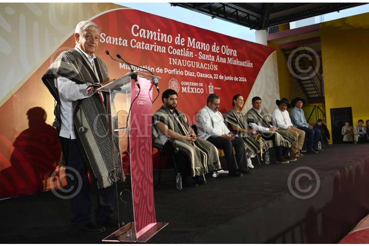 MIAHUATLÁN DE PORFIRIO DÍAZ, OAXACA, 23JUNIO2024.- Andrés Manuel López Obrador, Presidente de México encabezó la inauguración del camino de mano de obra Santa Catarina Coatlán – Santa Ana Miahuatlán. Lo acompañaron: Salomón Jara Cruz, Gobernador de Oaxaca. Jorge Nuño Lara, Secretario de Infraestructura, Comunicaciones y Transportes. Adelfo Regino Montes, Director General del Instituto Nacional de los Pueblos Indígenas. Juan Pablo de Botton Falcón, Subsecretario de Egresos de la Secretaría de Hacienda y Crédito Público. Juan Cruz Santiago, Agente Municipal de Santa Catarina Coatlán, Miahuatlán de Porfirio Díaz. FOTO: PRESIDENCIA/CUARTOSCURO.COM