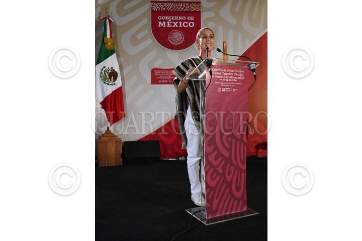 GUELATAO DE JUÁREZ, OAXACA, 21SEPTIEMBRE2024.- Claudia Sheinbaum Pardo, presidenta electa de México durante su intervención en la inauguración del Camino de Benito Juárez y evaluación de Caminos de mano de obra de Oaxaca en las Canchas techadas de Guelatao de Juárez. FOTO: PRESIDENCIA/CUARTOSCURO.COM