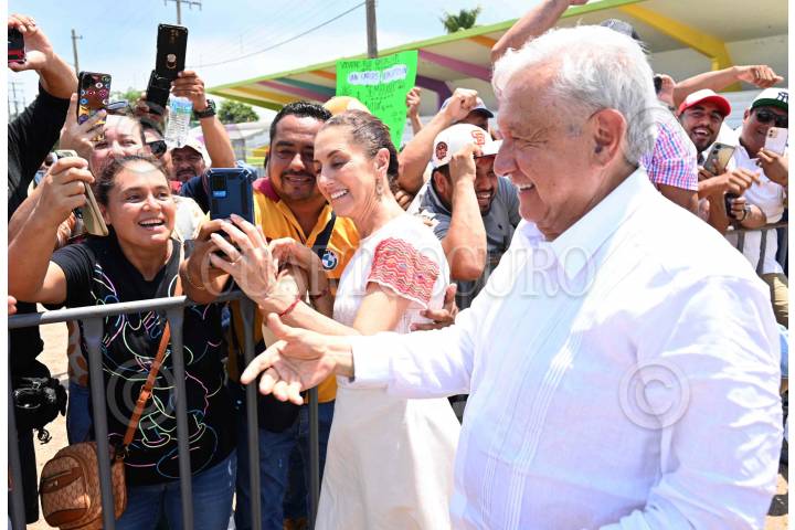 SAYULA DE ALEMÁN, VERACRUZ, 04AGOSTO2024.- Claudia Sheinbaum Pardo, Presidenta Electa de México, y Andrés Manuel López Obrador, Presidente de México, saludan a los asistentes de la inauguración de la carretera Acayucan-La Ventosa. FOTO: ALBERTO ROA/CUARTOSCURO.COM