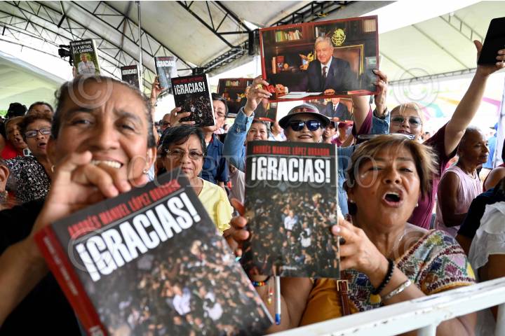 MINATITLÁN, VERACRUZ, 04AGOSTO2024.- Simpatizantes del Presidente de México muestran ejemplares el último libro del tabasqueño, "Gracias", durante la inauguración del camino Minatitlán-Hidalgotitlán, en Unidad Deportiva “Benito Juárez”. FOTO: PRESIDENCIA/CUARTOSCURO.COM