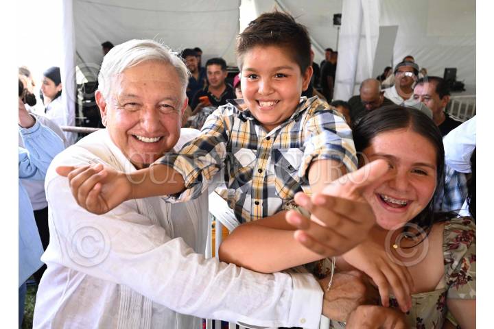 MINATITLÁN, VERACRUZ, 04AGOSTO2024.- ; Andrés Manuel López Obrador, Presidente de México; saluda a un par de niños durante la inauguración del camino Minatitlán-Hidalgotitlán, en Unidad Deportiva “Benito Juárez”. FOTO: PRESIDENCIA/CUARTOSCURO.COM
