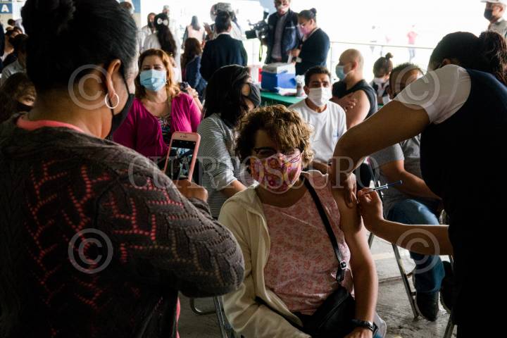 Una mujer es vacunada con la dosis de AstraZeneca contra la Covid-19 en Azcapotzalco.