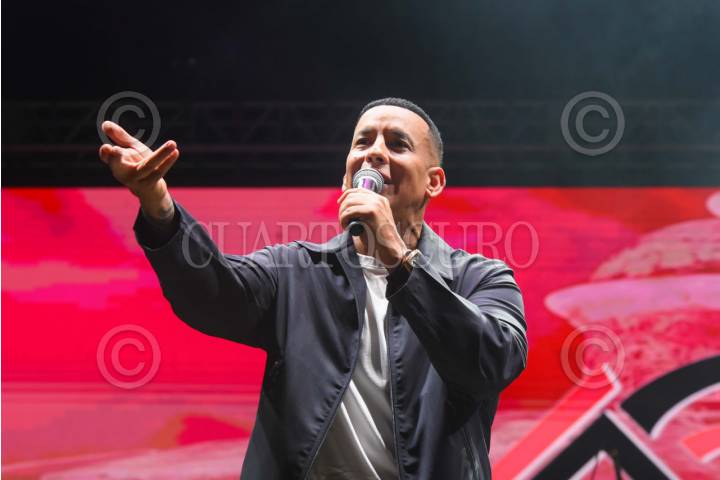 CAMPECHE,CAMPECHE, 11JULIO2025.- El puertoriqueño Raymond Ayala, mejor conocido como Daddy Yankee, regresó a Campeche en su nueva faceta convertido en cristiano. Durante su mensaje de fe " La espera que desespera" en el evento Dunamis que se llevo a cabo en el Foro Ah Kim Pech, el puertoriqueño afirmó que "Jesús nunca llega tarde. Todos podemos cambiar en la vida y ser un ejemplo. Dios siempre nos tiene preparados para una obra". FOTO: MICHAEL BALAM/CUARTOSCURO.COM