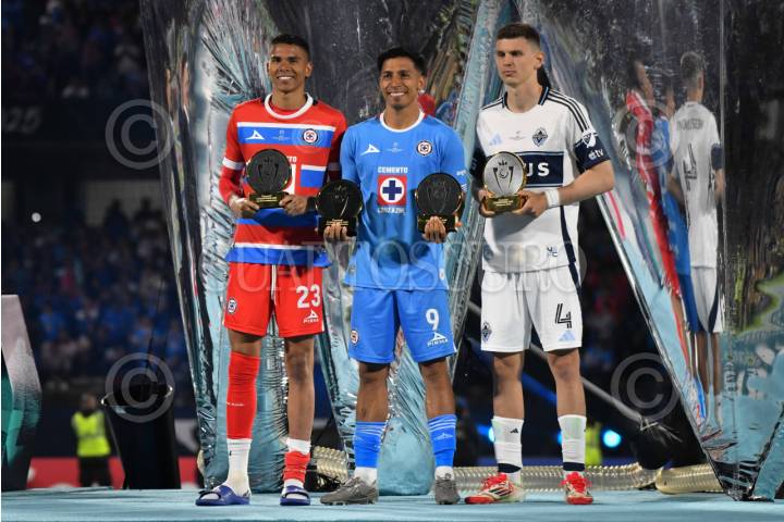 CIUDAD DE MÉXICO, 01JUNIO2025.- El Club Cruz Azul se coronó en la Final de la Copa de Campeones de la Concacaf 2025 al vencer cinco goles a cero a los Whitecaps, partido a cabo en el Estadio Olímpico Universitario. En la imagen, los galardonados del torneo: Kevin Mier (Cruz Azul) como mejor portero; Ángel Sepúlveda (Cruz Azul) como mejor goleador, y jugador de la final; y Ranko Veselinović (Whitecaps) como equipo en la categoría "juego limpio" al recibir la menor cantidad de tarjetas. FOTO: MARIO JASSO/CUARTOSCURO.COM