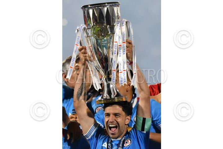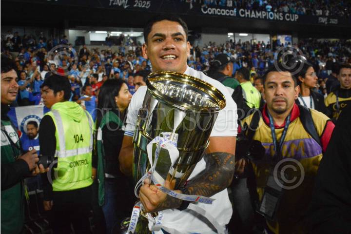 CIUDAD DE MÉXICO, 01JUNIO2025.- El Club Cruz Azul se coronó en la Final de la Copa de Campeones de la Concacaf 2025 al vencer cinco goles a cero a los Whitecaps, partido llevado a cabo en el Estadio Olímpico Universitario. En la imagen, Gabriel "El toro" Fernández, realiza la vuelta olímpica con el trofeo FOTO: MARIO JASSO/CUARTOSCURO.COM