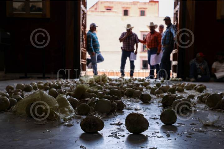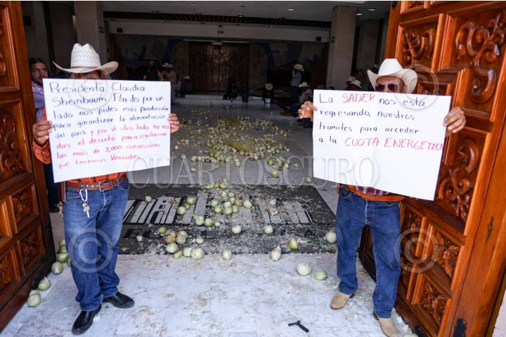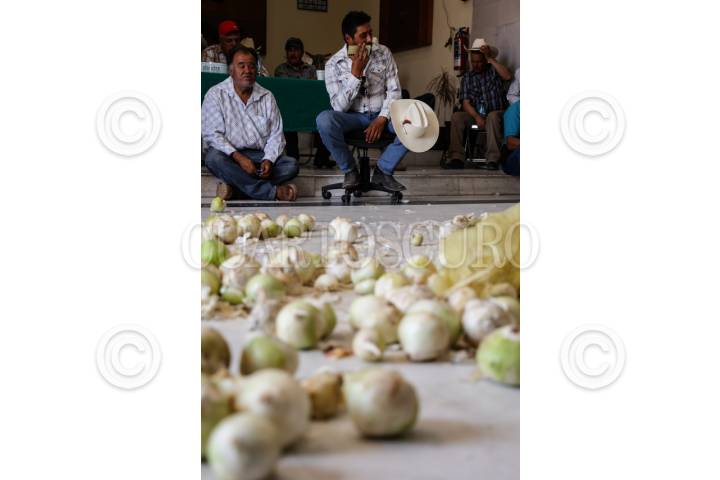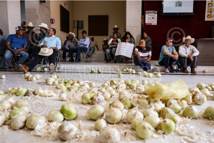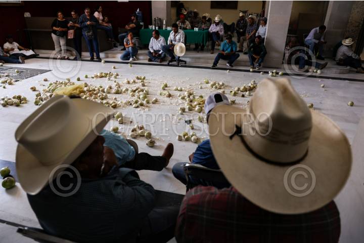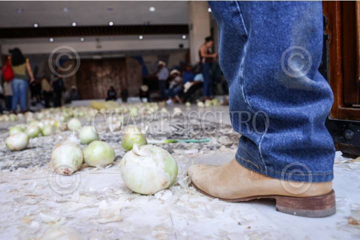 ZACATECAS, ZACATECAS, 20MAYO2025.- Productores agrarios con pozos de riego, de diferentes municipios del estado, se manifestaron en el Congreso Estatal en demanda de la nivelación de precios en los recibos por el cobro de la energía eléctrica. En el vestíbulo tiraron cebolla cosechada para denunciar que sus productos no se venden pero al mismo tiempo tienen deudas asfixiantes con la Comisión Federal de Electricidad. FOTO: ADOLFO VLADIMIR /CUARTOSCURO.COM