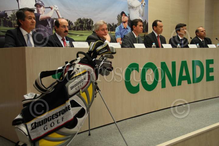 MÉXICO, D.F., 07JULIO2015.- La CONADE e INDEPORTE anuncian la Bridgestone America`s Golf Cup y la participación del golfista norteamericano Tiger Woods. La copa se llevara a cabo en uno de los campos de Golf de 18 hoyos más antiguo de la ciudad de México el Club Campestre del 22 al 25 de octubre. Presidieron el evento: Eduardo Rello, presidente del Club Campestre; Daniel Benvenuti, presidente del Bridgestone México; Carlos Bremer, presidente de Value; Alfredo Castillo, director general de CONADE; Horacio de la Vega, director de INDEPORTE; Diego Diaz, gerente general Bridgestone America`s Golf Cup y Pablo Suinaga, presidente de la Federación Mexicana de Golf. FOTO: ISABEL MATEOS /CUARTOSCURO.COM