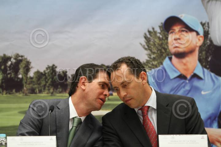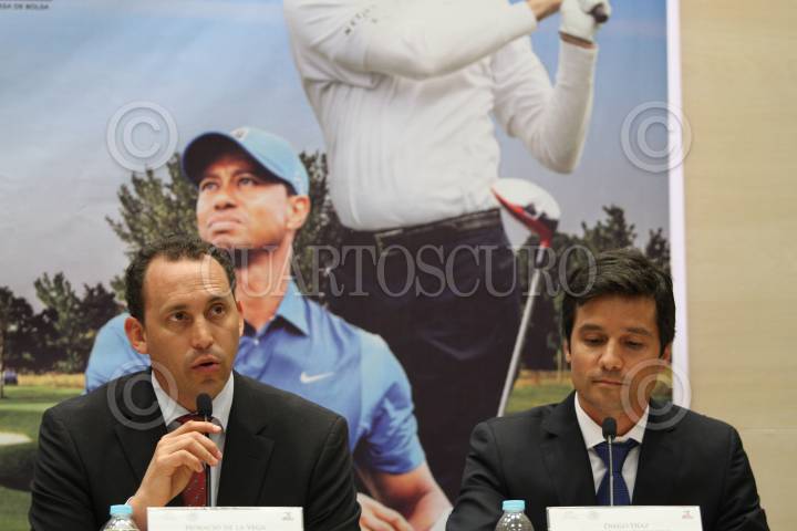 MÉXICO, D.F., 07JULIO2015.- La CONADE e INDEPORTE anuncian la Bridgestone America`s Golf Cup y la participación del golfista norteamericano Tiger Woods. La copa se llevara a cabo en uno de los campos de Golf de 18 hoyos más antiguo de la ciudad de México el Club Campestre del 22 al 25 de octubre. Diego Diaz, gerente general Bridgestone America`s Golf Cup y Pablo Suinaga, presidente de la Federación Mexicana de Golf. FOTO: ISABEL MATEOS /CUARTOSCURO.COM
