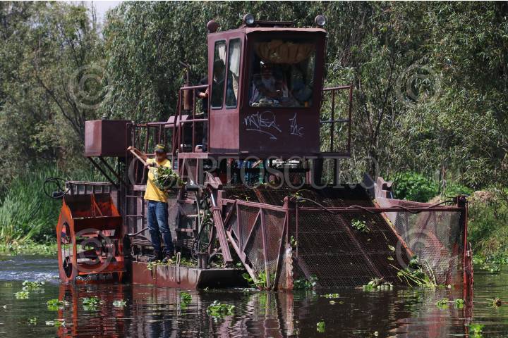 Un trabajador limpió la maleza acuática en una máquina en el Embarcadero Cuemanco, alcaldía Xochimilco
