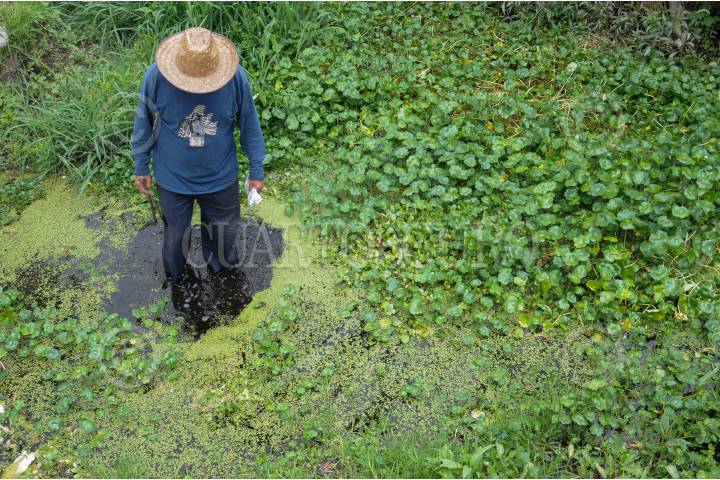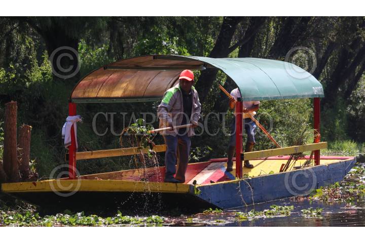 Un trabajador limpió la maleza acuática del Embarcadero Cuemanco, alcaldía Xochimilco