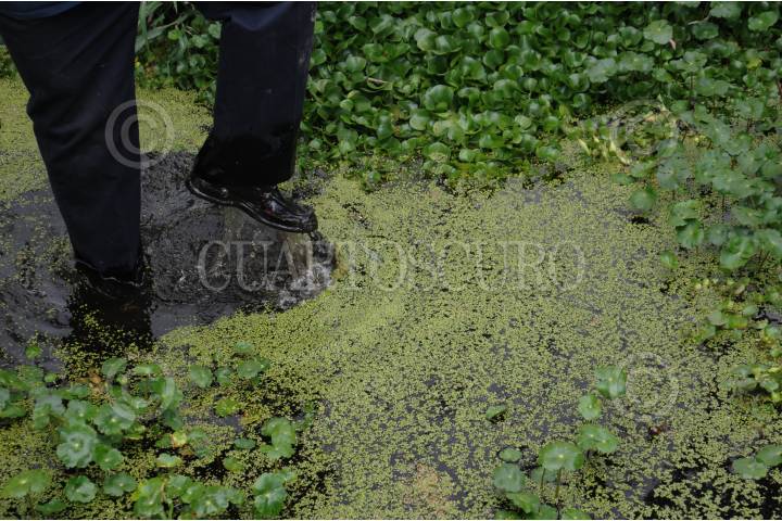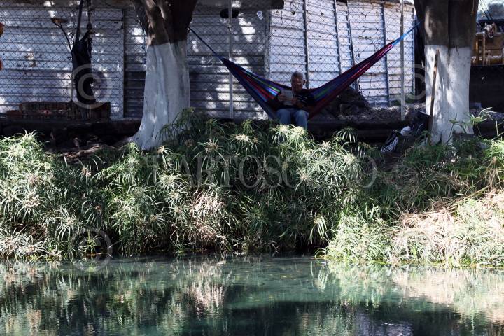 CIUDAD DE MÉXICO, 26JUNIO2024.- Un chinampero baja a uno de los canales para mostrar el nivel bajo del agua, el cual apenas rebasa su entrepierna. FOTO: DANIEL AUGUSTO /CUARTOSCURO.COM