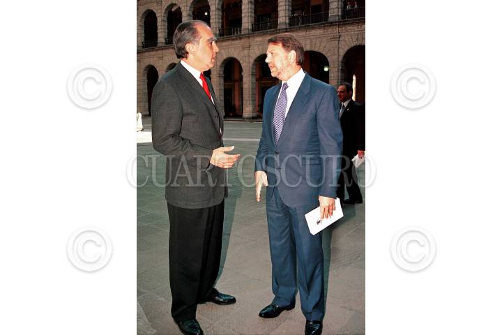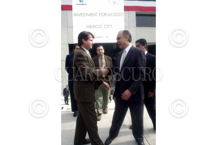 Fernando Canales Clariónd, Secretario de Economía, y Jose Luis Romero Hicks, Director Nacional de BANCOMEXT, a su salida del investment forum 2003 organizado por el BANCOMEXT. FOTO: Iván Stephens/CUARTOSCURO.COM