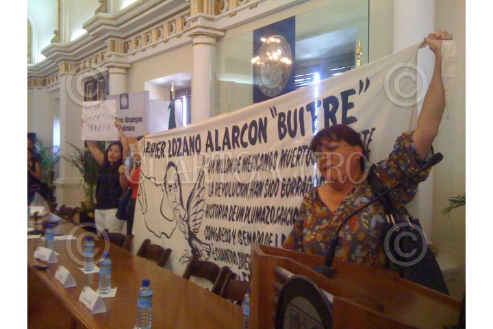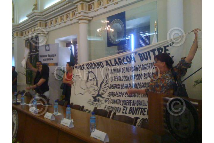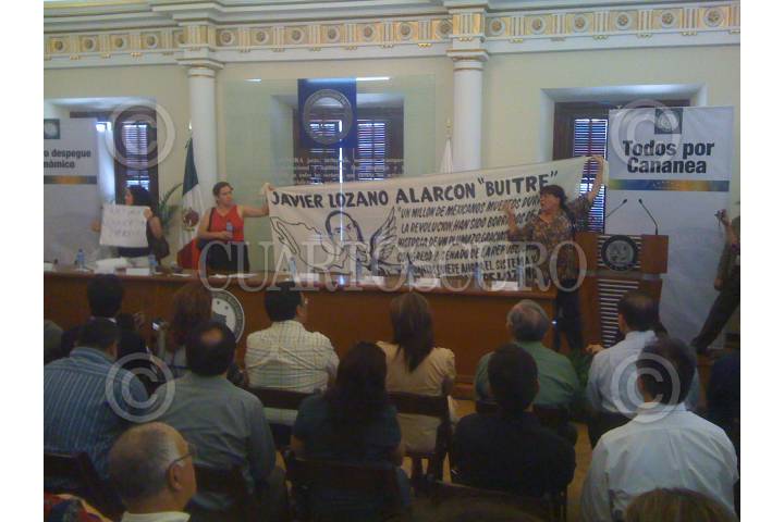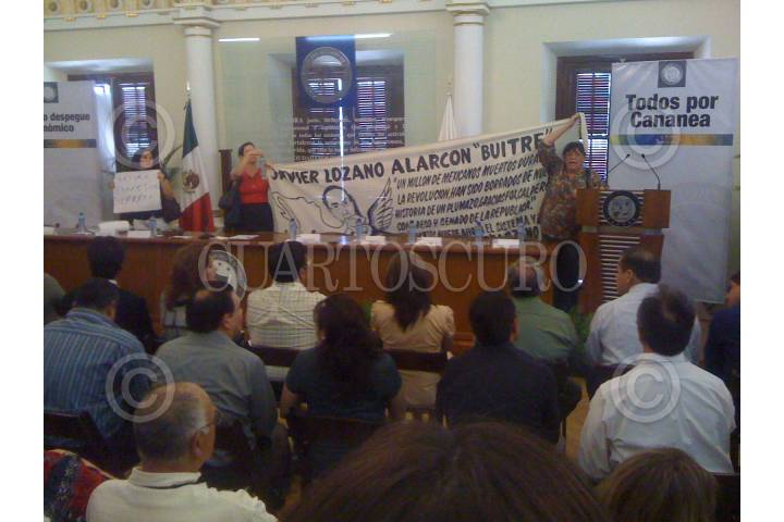 HERMOSILLO, SONORA, 07 JUNIO 2010.-Activistas irrumpieron en el Salón Gobernadores, de Palacio de Gobierno, durante el acto “Todos Somos Cananea”, en el cual el Gobernador del estado, Guillermo Padrés y el Secretario de Trabajo, Javier Lozano, dieron a conocer el paquete de apoyos tripartita (Gobierno estatal-Federal y Grupo México) por 58 mil millones de pesos. Luego de permanecer lanzando consignas, las tres damas fueron retiradas del recinto por elementos de seguridad del Gobierno del estado. FOTO: DOSSIERPOLITICO/CUARTOSCURO.COM