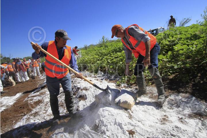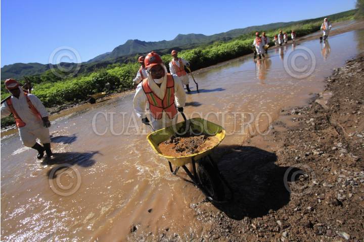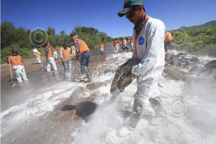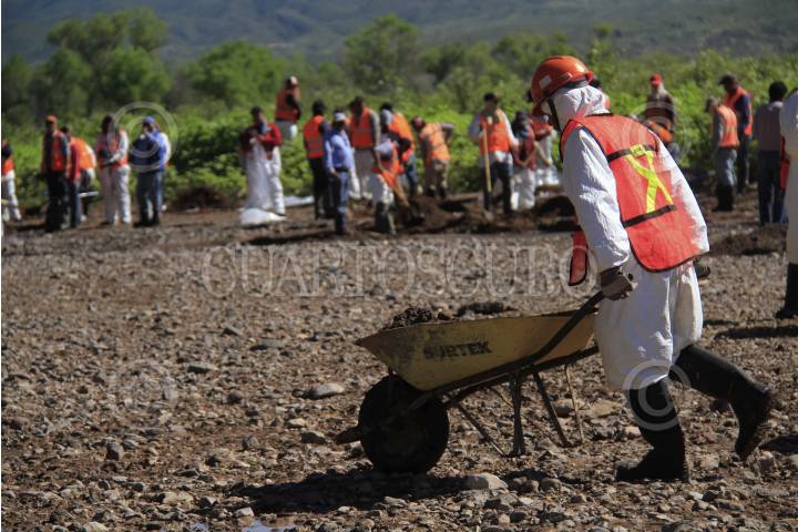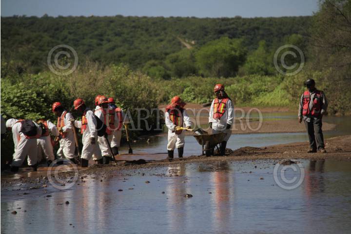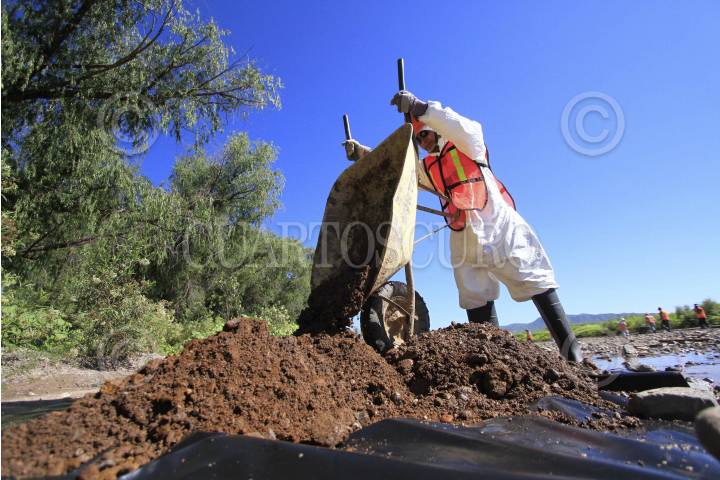 CANANEA, SONORA., 28AGOSTO2014.- Empleados de Grupo México y de empleo temporal del estado de Sonora realizan labores de limpieza en el Río Sonora y Bacanuchi, en el municipio de Arizpe. Como parte de la limpieza se remueve la tierra contaminada y se mezcla con cal para neutralizar los ácidos. El pasado 8 de agosto se registró una fuga en las tuberías de las instalaciones de Grupo México, que derivo en la contaminación de los ríos Sonora y Bacanuchi con 40 mil metros cúbicos de contaminantes altamente tóxicos. FOTO: MARGARITA GARCÍA /CUARTOSCURO.COM