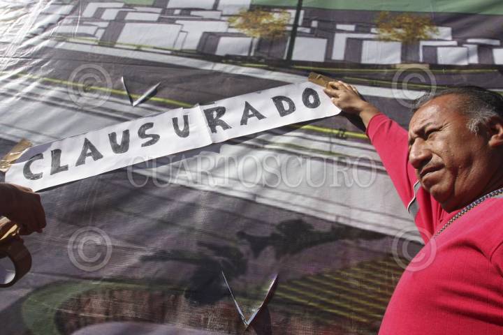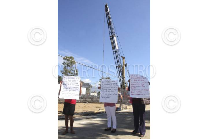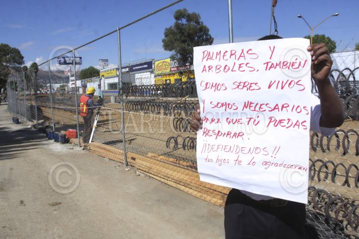 OAXACA, OAXACA, 09FEBRERO2012.- Integrantes del Colectivo de Organizaciones Ambientales de Oaxaca realizaron una protesta en inmediaciones del Crucero de 5 Señores, sitio en el que se realiza la obra del distribuidor vial. La obra fue clausurada de manera simbólica ya que esta no cuenta con los estudios de impacto ambiental argumentaron los ambientalistas. Hasta el momento dijeron, se han retirado 7 palmeras las cuales han sido replantadas en un pequeño parque en la agencia de Candiani y que no reciben la atención necesaria, sin embargo dijeron en total son 16 palmeras y más de 200 árboles los que peligran por esta obra. FOTO: ARTURO PÉREZ ALFONSO/CUARTOSCURO.COM