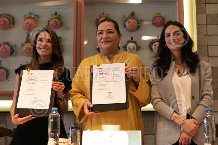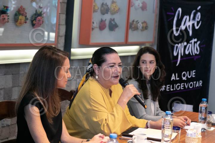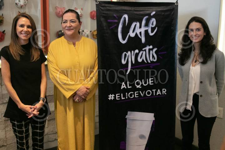 CIDAD DE MÉXICO, 29ABRIL2024.- Daniela Mijares Martínez, presidenta ejecutiva de CANIRAC; Guadalupe Taddei Zavala, presidenta del INE, y Alexandra Zapata Hojel, directora general de Me Veo, lanzaron la campaña nacional “Café Gratis al que #EligeVotar”, que tiene como objetivo promover la participación ciudadana del voto libre y secreto en la jornada electoral del próximo 2 de junio, en la cual participarán los restaurantes afiliados a la Cámara Nacional de la Industria de Restaurantes y Alimentos Condimentados (CANIRAC). FOTO: MOISÉS PABLO/CUARTOSCURO.COM