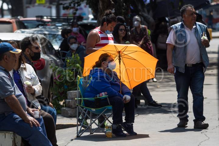 Familiares esperan bajo los intensos rayos del sol noticias de familiares internados en el área de urgencias del Hospital de los Venados IMSS.